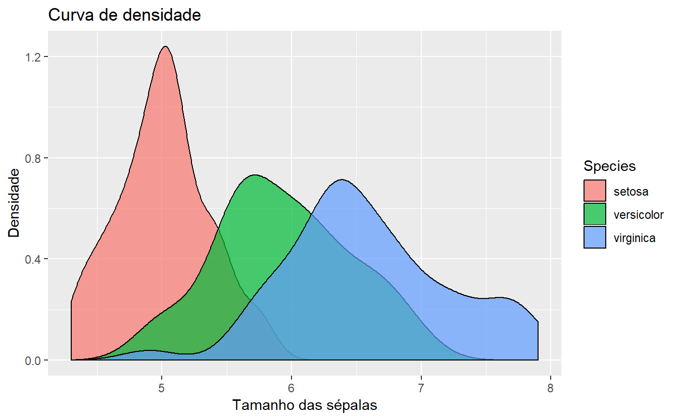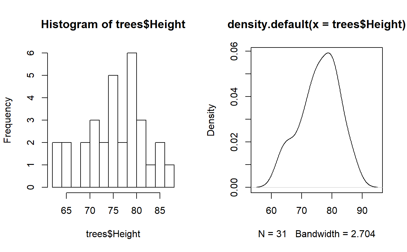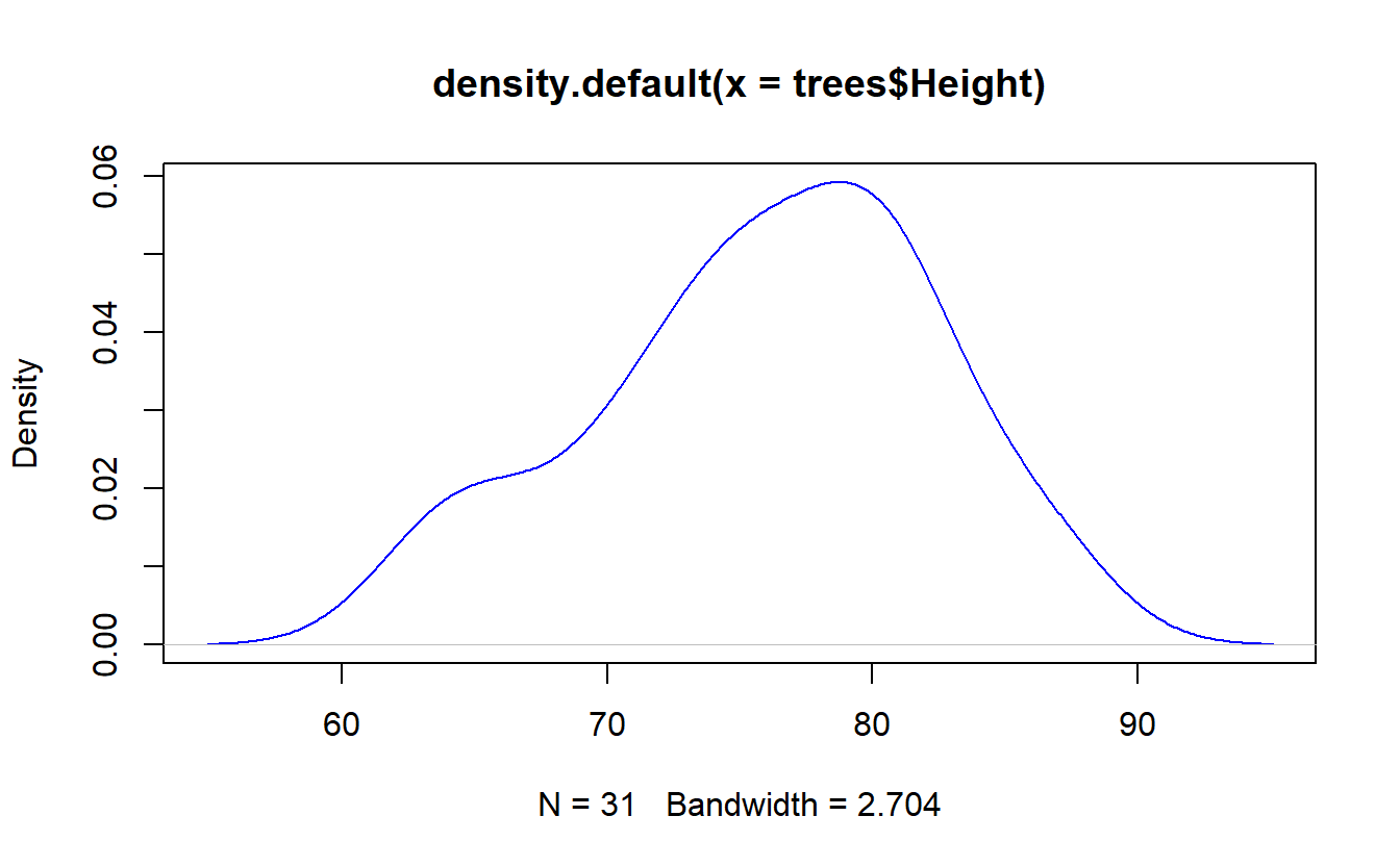 Ainda tomando como base o exemplo anterior, é possível que se deseje conhecer a curva que descreve a distribuição de densidade das alturas das árvores no dataset. Isso é possível através da função density().