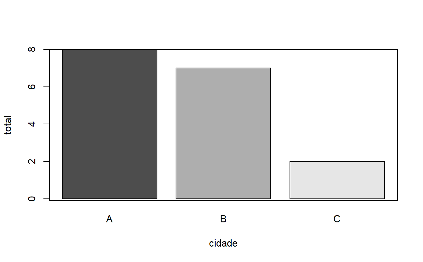 barplot(hab$quantidade,col=gray.colors(3),xlab="cidade",ylab="total",