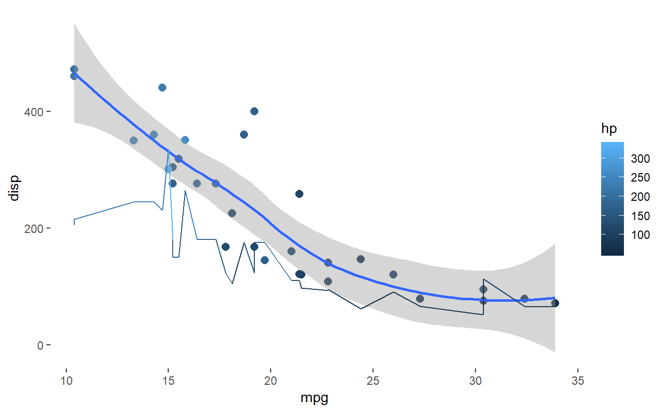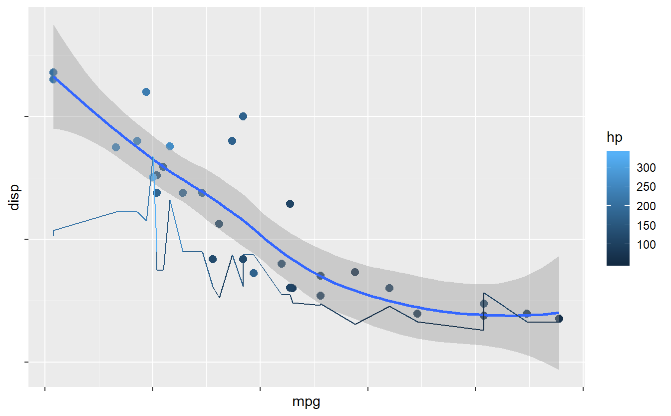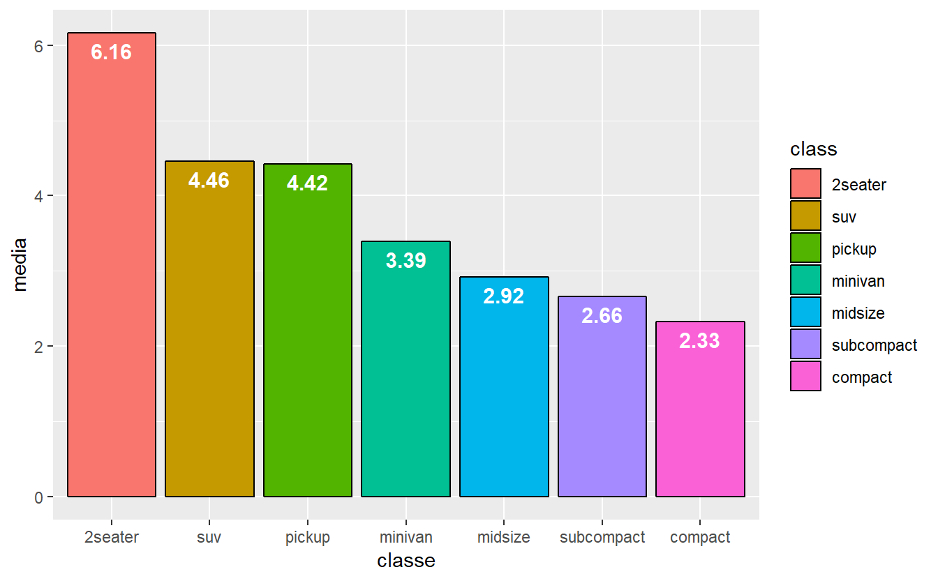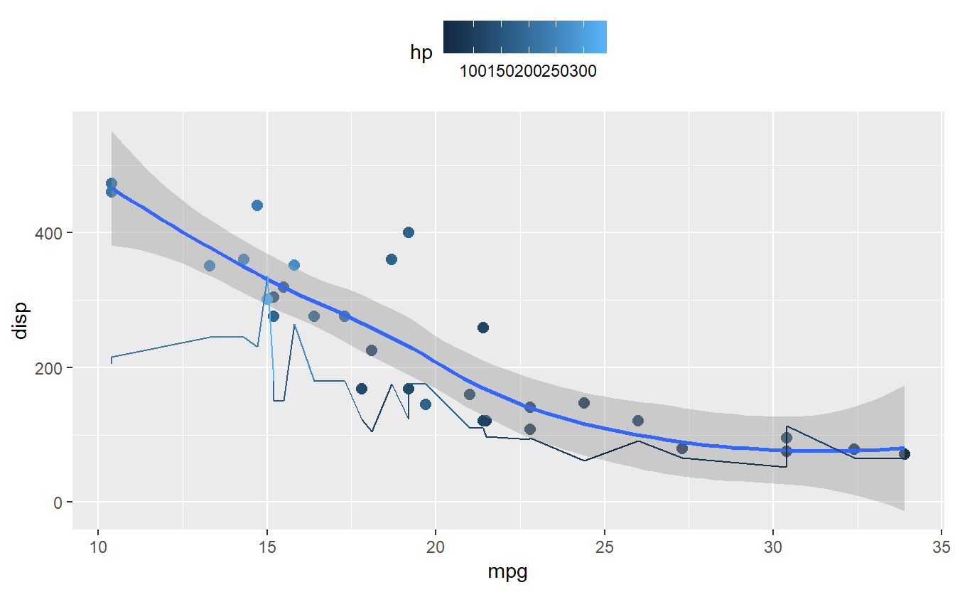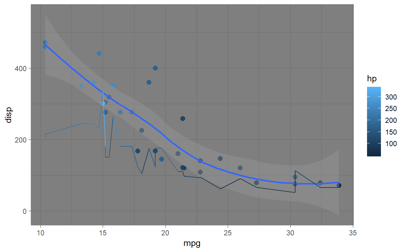 A primeira camada é responsável pelo conteúdo dos dados, enquanto que a segunda diz respeito à primeira etapa de visualização (escala) do gráfico. A terceira descreve a geometria de como os dados serão apresentados, ao passo que a quarta camada possibilita a visualização de várias facetas diferentes do mesmo dataset. A quinta camada possibilita a análise estatística, a sexta delimita as regiões relevantes das coordenadas do gráfico e, por fim, a sétima camada apresenta o tema geral do trabalho. Todas essas etapas poderão ser vistas nos exemplos seguintes.