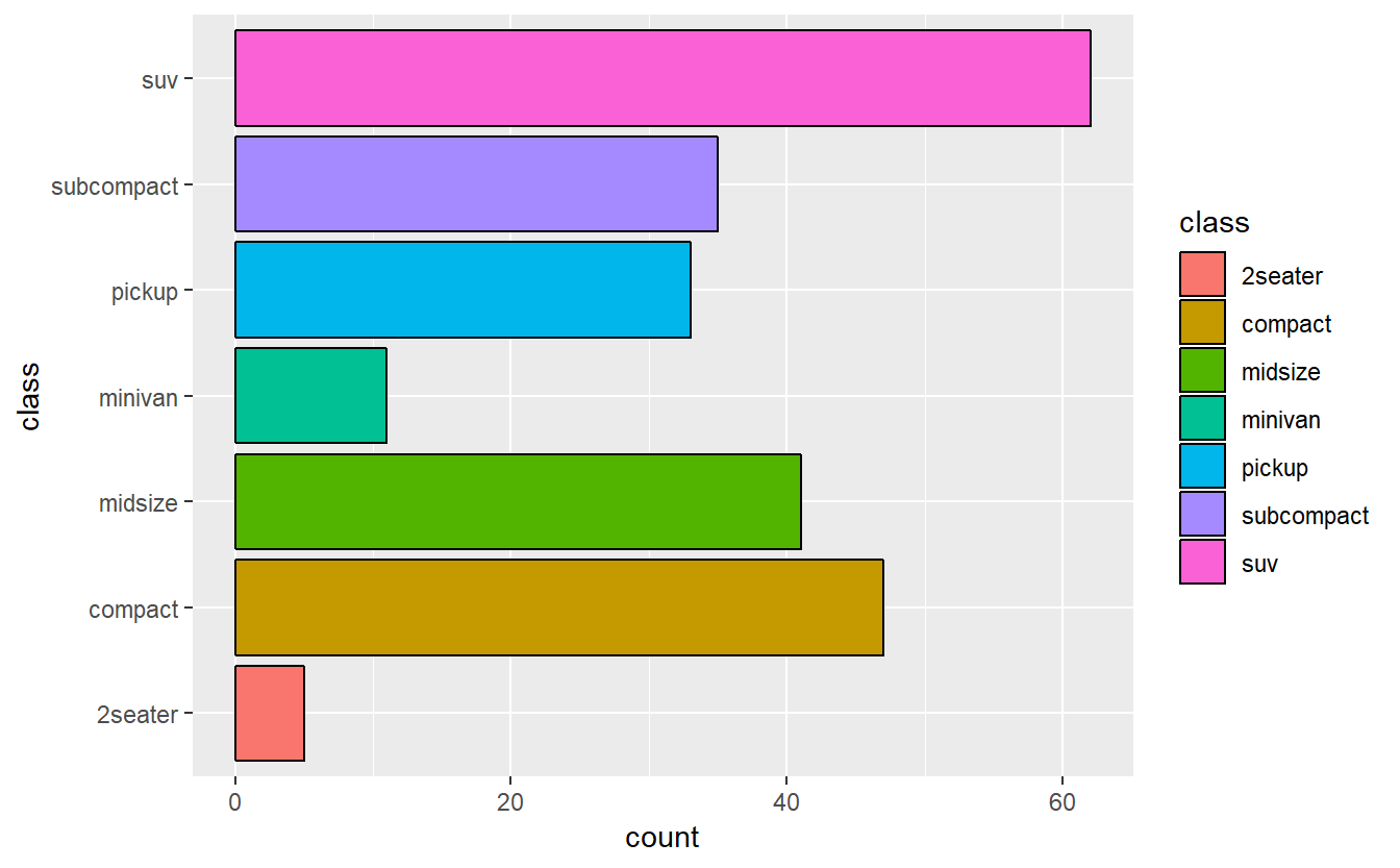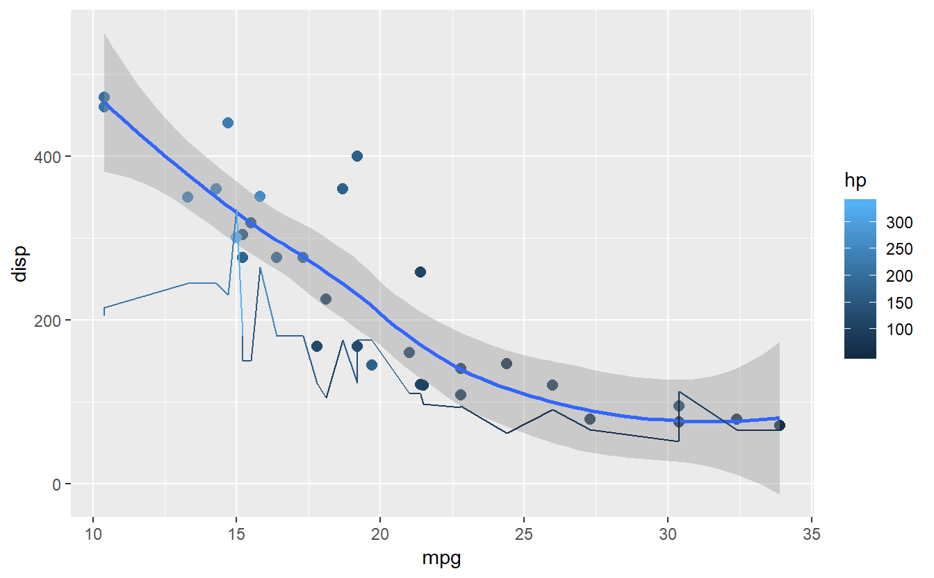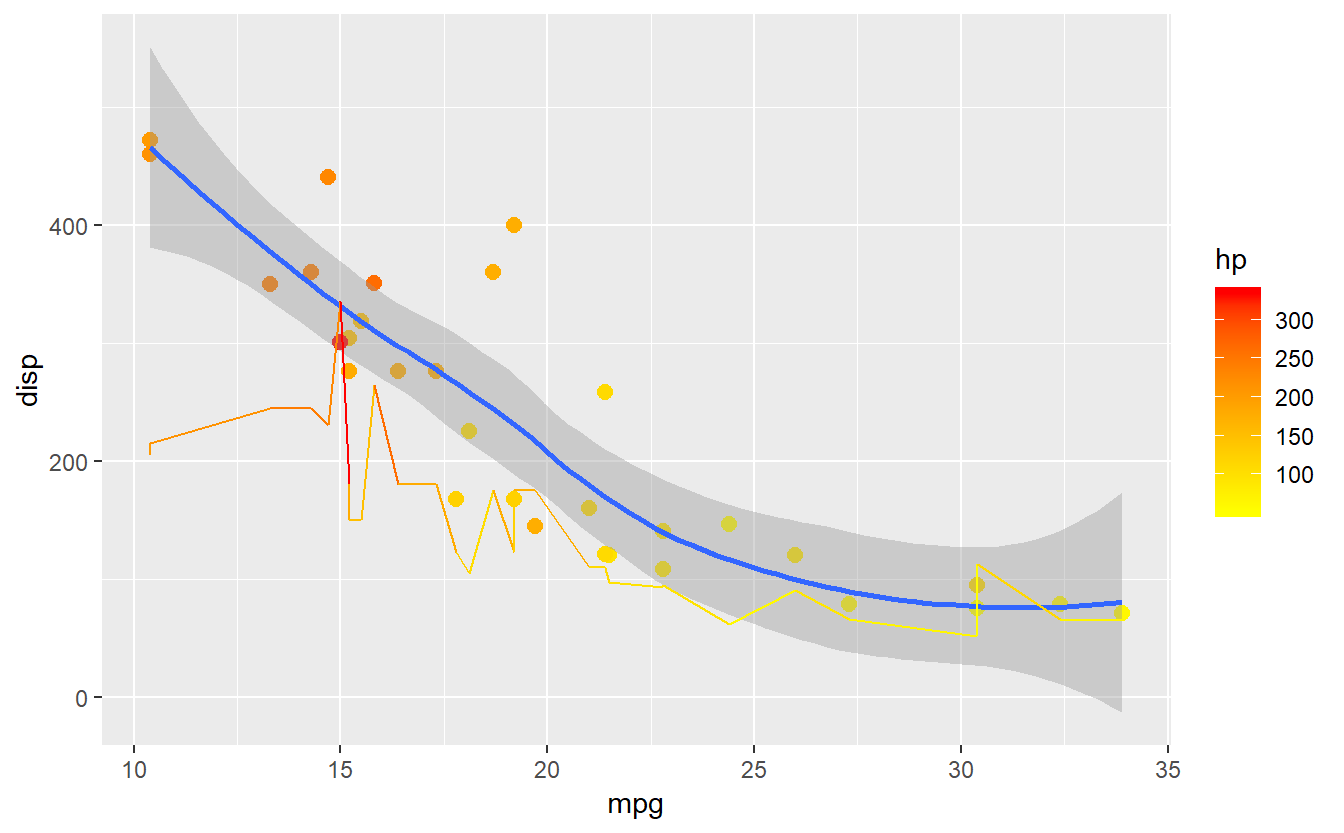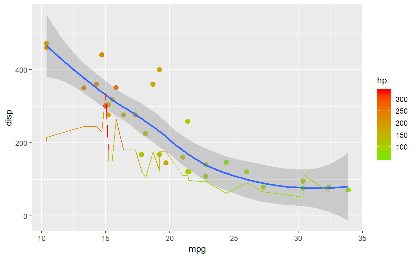 A primeira camada é responsável pelo conteúdo dos dados, enquanto que a segunda diz respeito à primeira etapa de visualização (escala) do gráfico. A terceira descreve a geometria de como os dados serão apresentados, ao passo que a quarta camada possibilita a visualização de várias facetas diferentes do mesmo dataset. A quinta camada possibilita a análise estatística, a sexta delimita as regiões relevantes das coordenadas do gráfico e, por fim, a sétima camada apresenta o tema geral do trabalho. Todas essas etapas poderão ser vistas nos exemplos seguintes.