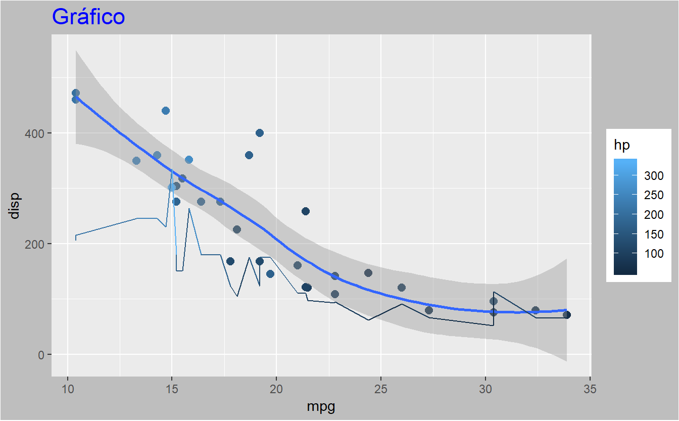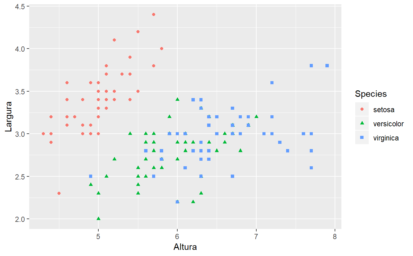 O gráfico de pontos, ou dispersão, pode ser usado para melhor representar as observações em duas dimensões. Esse recurso permite enxergar possíveis tendências, correlações e a sua magnitude. No R, a função plot() pode exercer nativamente esse papel, juntamente com alguns argumentos extras: