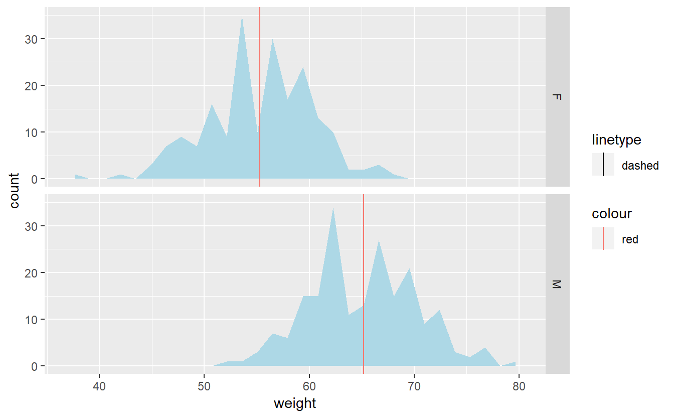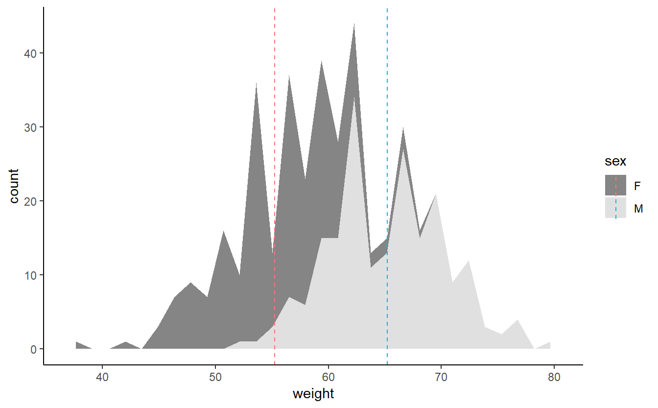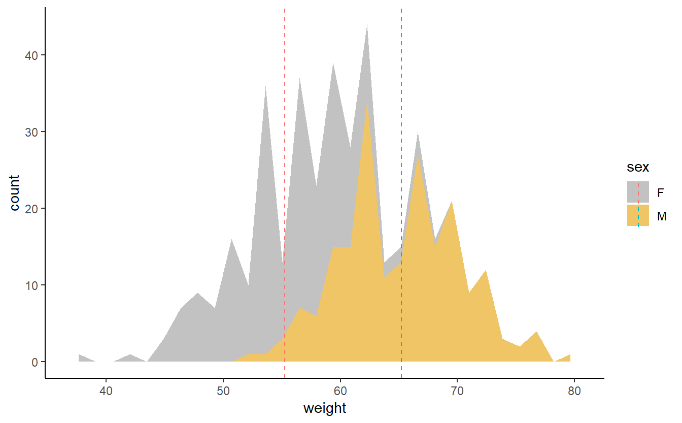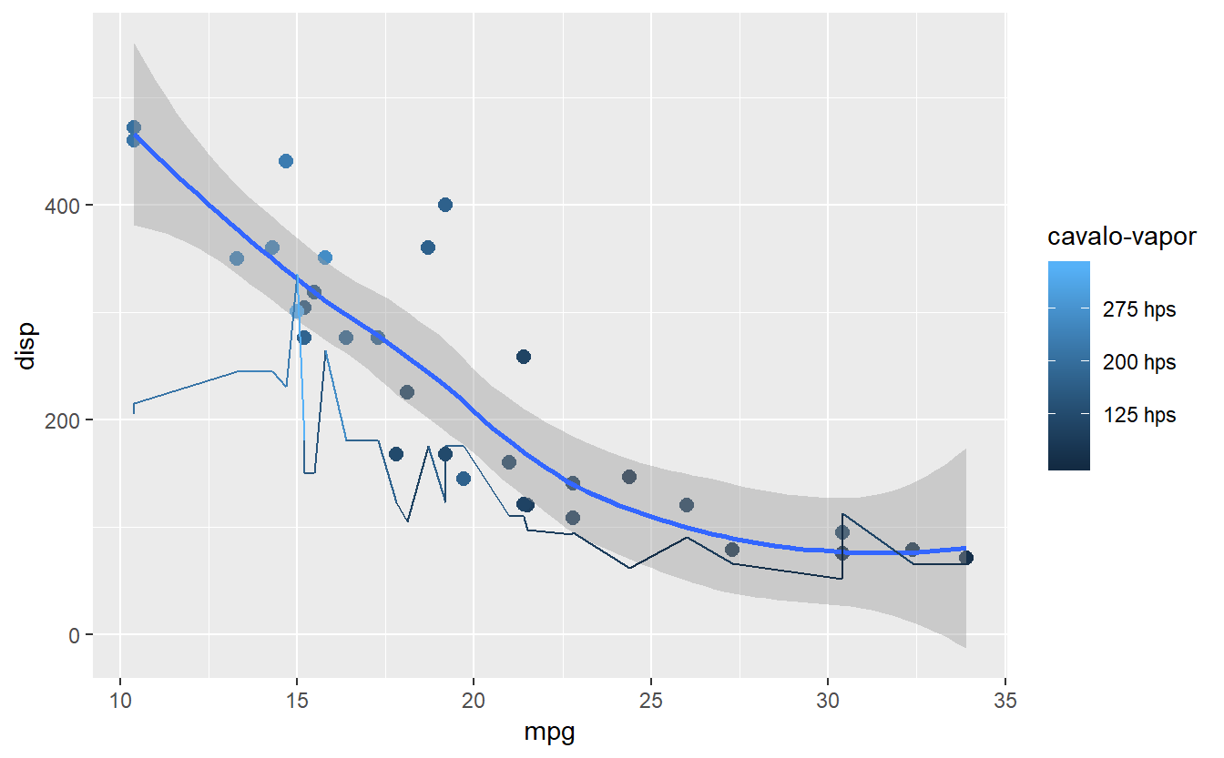 Em uma situação em que seja necessário se comparar mais de uma representação, o recurso de sobreposição é indispensável. Tomemos como exemplo o caso anterior, que foi representado tanto em um gráfico de histograma quanto por um gráfico de densidade. Em R, é possível sobrepor as duas exibições utilizando a função par().