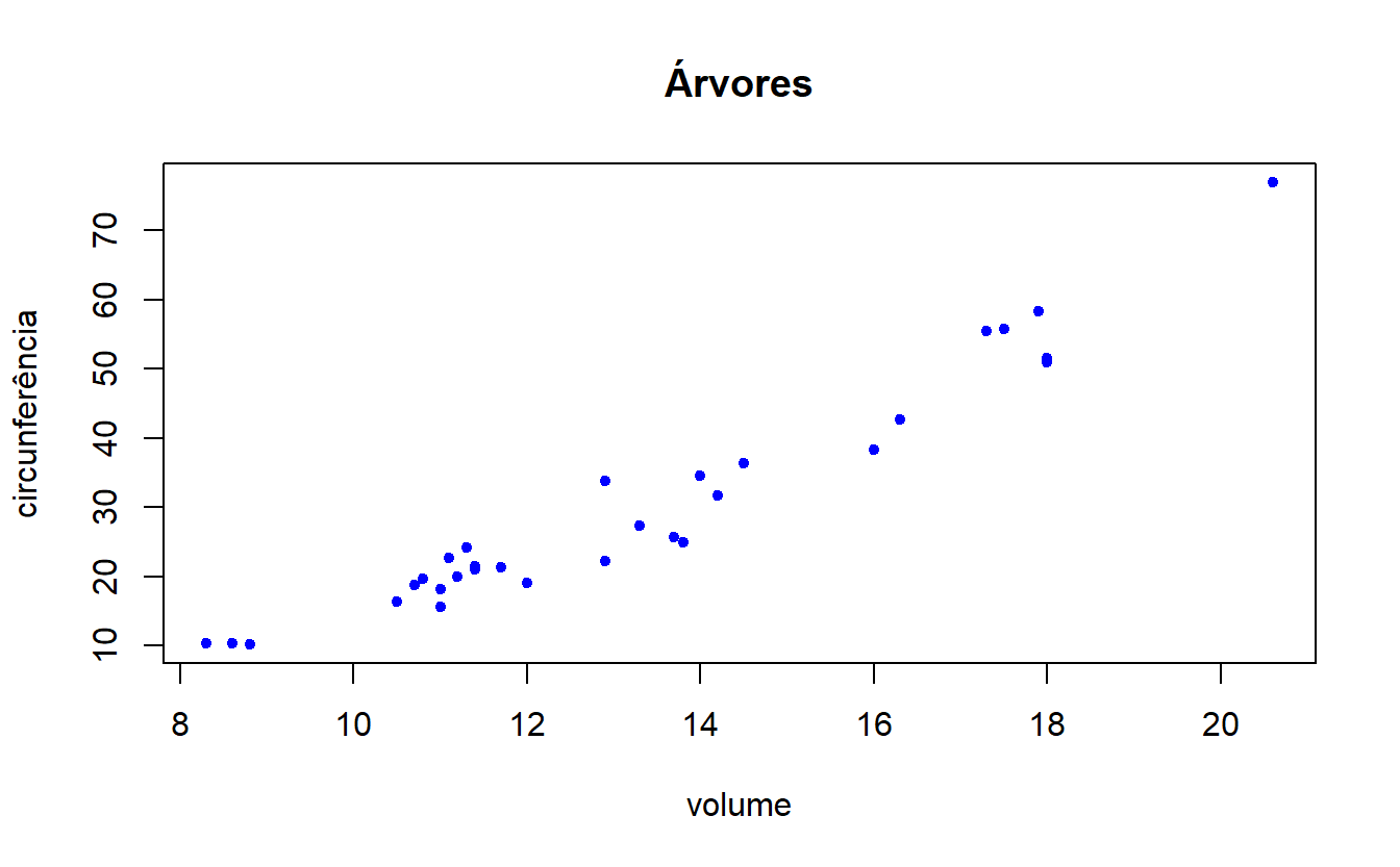 main="Árvores",ylab="circunferência",xlab="volume",col="blue",