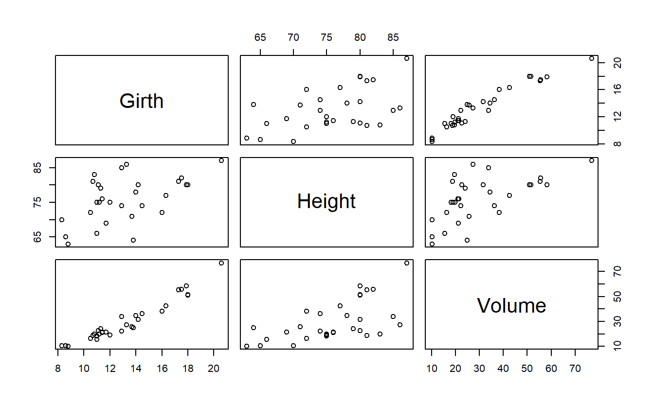 Para uma visão geral do dataset trees, o gráfico de dispersão também é muito útil, pois é possível enxergar a correlação de todas as variáveis com elas mesmas, em um grid amplo, utilizando a função plot() sem nenhum argumento, além do dataset em questão: